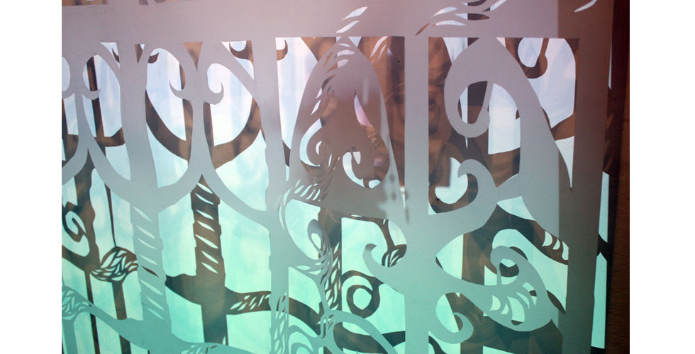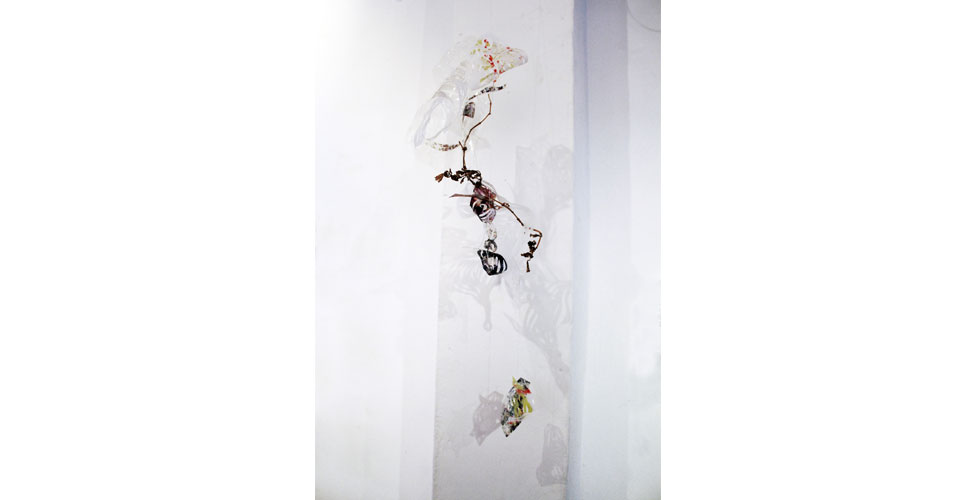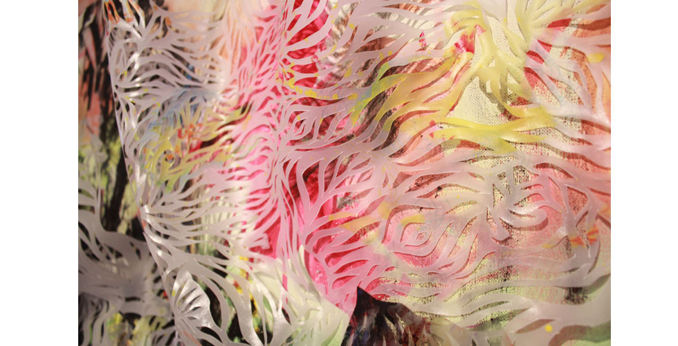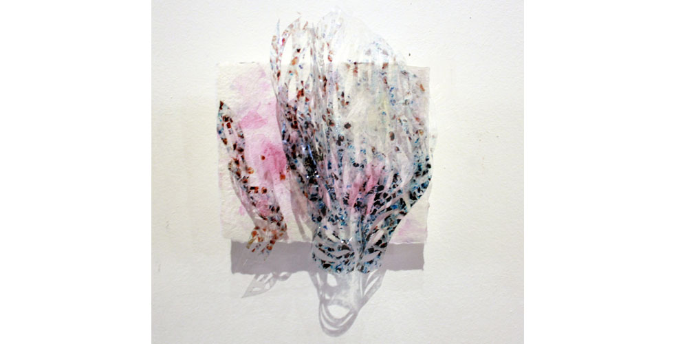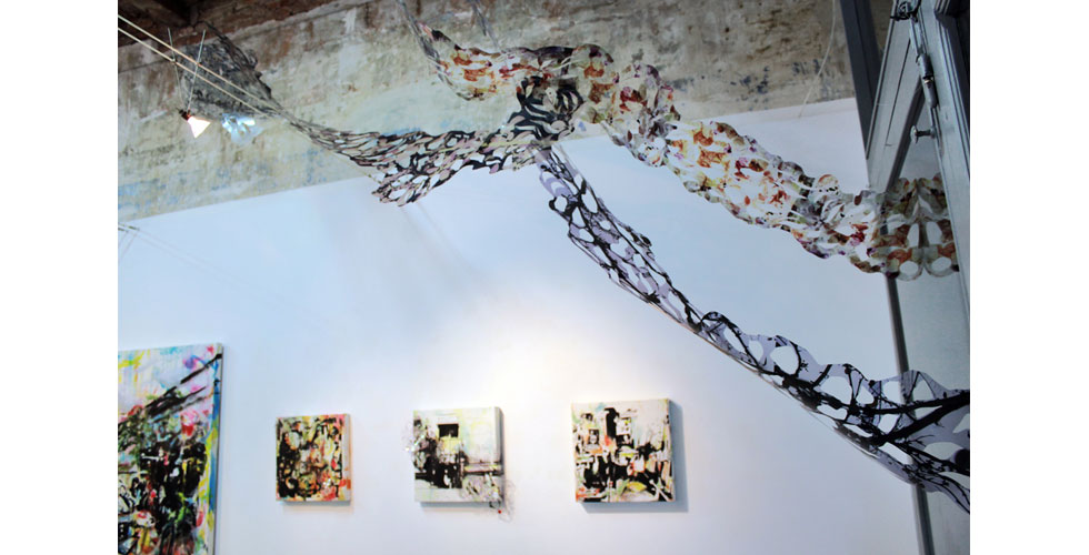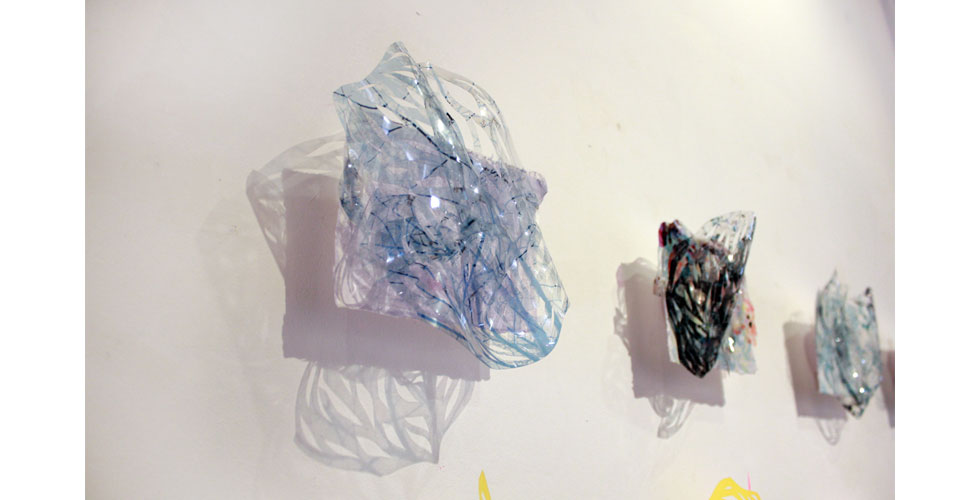 The exhibition featured paintings, cut paper, a video collage, and projection mapping onto the entryway of the gallery by Barcelona-based scientist and artist Elizabeth Henaff.