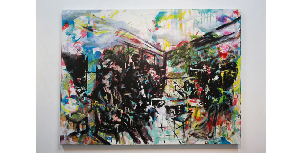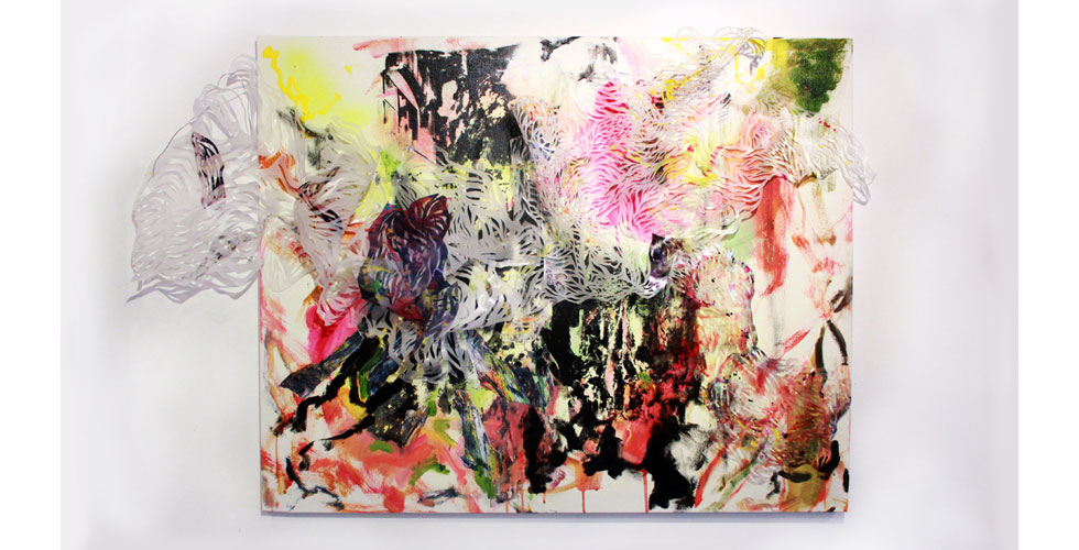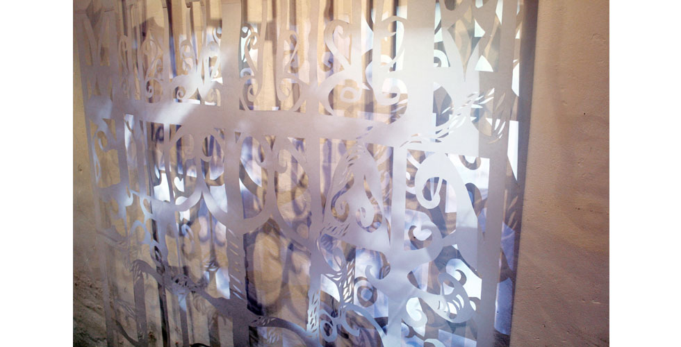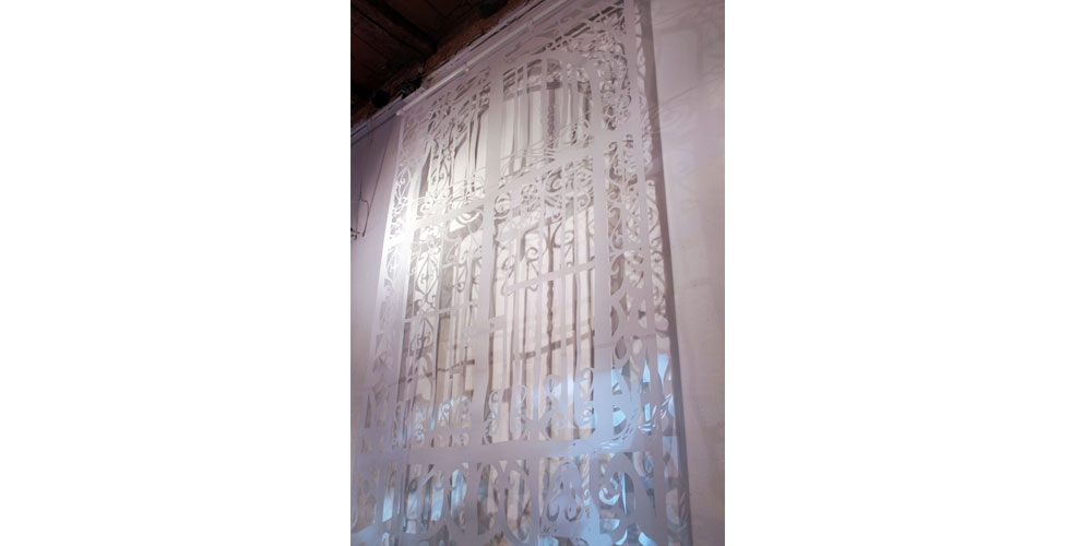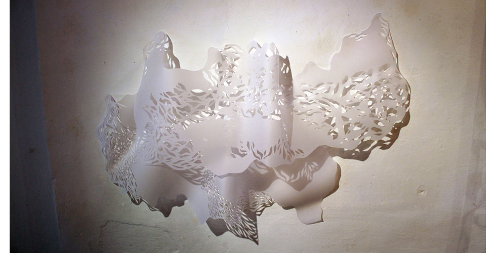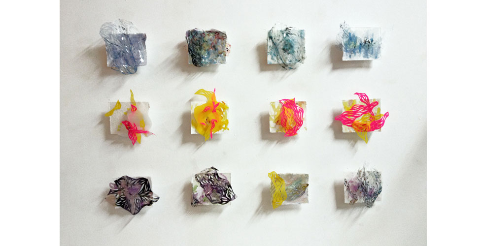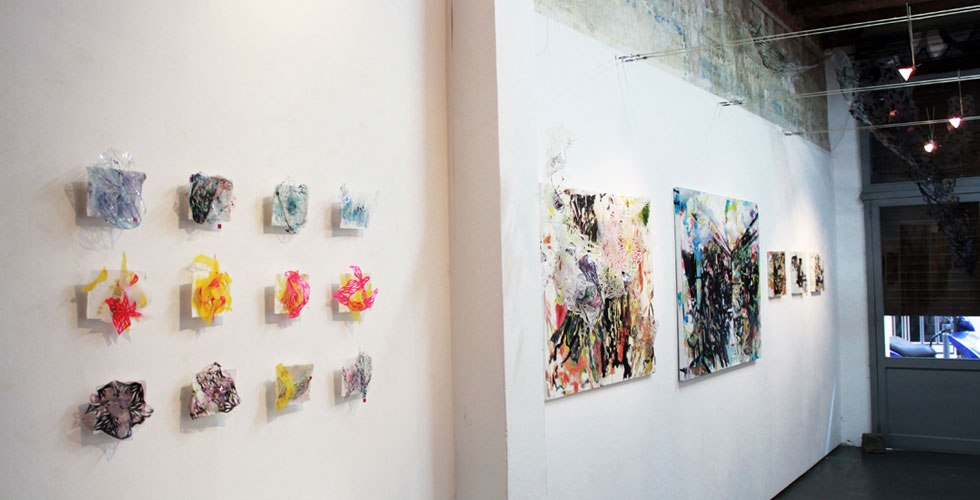 The exhibition featured paintings, cut paper, a video collage, and projection mapping onto the entryway of the gallery by Barcelona-based scientist and artist Elizabeth Henaff.